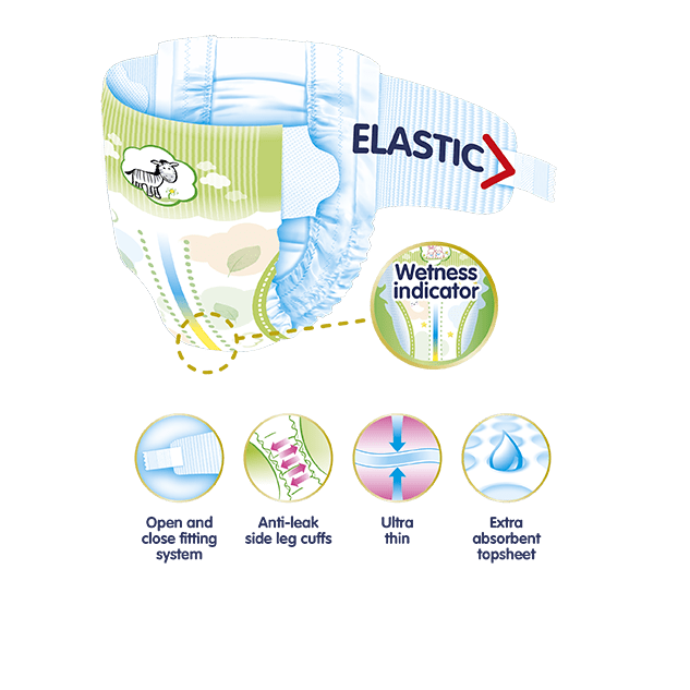 - With wetness indicator, which changes colour, indicating when the diaper needs to be changed.