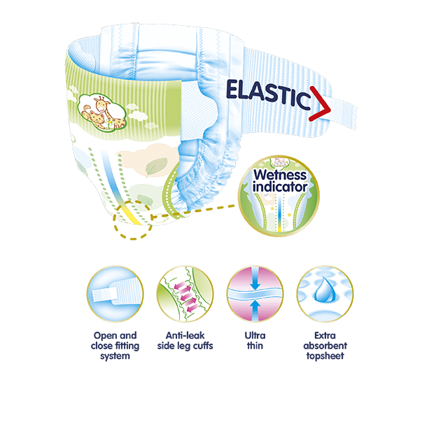 • With wetness indicator, which changes colour, indicating when the diaper needs to be changed.