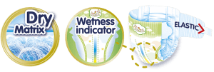 - With wetness indicator, which changes colour, indicating when the diaper needs to be changed.