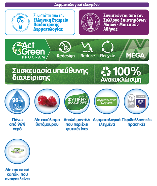 Τα υγρά μαντήλια BabyCare Family Raspberry σχεδιάστηκαν για όλη την οικογένεια (μωρά, παιδιά, ενήλικες), για extra υγιεινή και απαλή περιποίηση της επιδερμίδας, κάθε μέρα. Συμπληρώνουν επίσης το κοινό χαρτί τουαλέτας, για έναν αποτελεσματικό καθαρισμό. Εξαιρετικά ανθεκτικά και πολύ απαλά και με ειδικά μελετημένη σύνθεση με εκχύλισμα βατόμουρου, αφήνουν μια μοναδική αίσθηση καθαριότητας και βαθιάς φροντίδας. Με υπέροχο άρωμα βατόμουρου. Με πρακτικό καπάκι που ανοιγοκλείνει για ασφαλή διατήρηση της υγρασίας του προϊόντος, χωρίς να στεγνώνει.